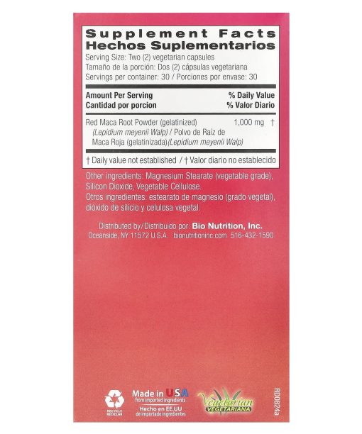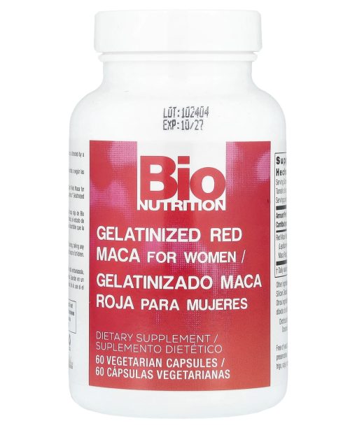 1,000 mg Per 2 Capsule ServingDietary SupplementVegetarianGelatinized Red Maca is considered an Adaptogen. Bio Nutrition’s Red Maca for women from Peru may help support energy, stamina, mood, and hormonal balance. Gelatinized Maca is up to 90% more absorbable than non gelatinized Maca Root.