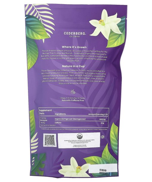 Tea CompanySingle Estate TeaPacked with Hydro and Clean PowerUSDA OrganicCertified Organic by Pro-CertKosherWhere it’s GrownThe sub-tropical climate of Kandi, Sri Lanka is the perfect setting for the Moringa Tree to grow and flourish. Cederberg Organic Moringa Leaf is Non-GMO, sustainably farmed without pesticides and hand-picked at peak maturity. It brews a vivid bright green cup with a fresh earthy aroma and smooth finish. Nature In a Cup™ The environment is our collective treasure. As such, we are committed to a zero-impact production process. First, we partner with organic farms using sustainable growing techniques. Next, we pack them in fully compostable teabags, made of renewable abaca and cellulose fibers, free of bleach, glue and adhesives. Finally, they are packed with hydro and clean energy. Enjoy a cup as nature intended.