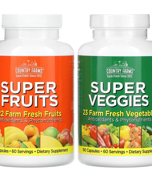 Contains: Country Farms, Super Fruits, 180 CapsulesCountry Farms, Super Veggies, 180 CapsulesSuper Fruits22 Farm Fresh FruitsAntioxidants & Phytonutrients  Super Veggies23 Farm Fresh VegetablesAntioxidants & PhytonutrientsCountry Farms® … real food from real farms, is a great way to supplement your diet with the goodness and benefits of eating wholesome fresh foods every day. Made using whole fruits and vegetables, Country Farms® is harvested at the peak of ripeness and then produced using the most advanced freeze-dried technology to lock in freshness with each batch for purity and richness.Gluten FreeVeganFarm Fresh Since 1975 Dietary SupplementNon GMO Soy FreePure Supplements You Can Trust Fresh From The Garden