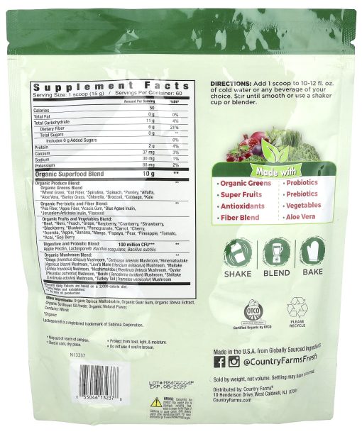 Farm Fresh Since 197550 Organic Super FoodsFruits, Vegetables, Super Greens, Mushrooms & ProbioticsUSDA Organic6 g FiberNo Added SugarVeganDietary SupplementCertified Organic by OTCOMade with:Organic GreensSuper FruitsAntioxidantsFiber BlendProbioticsPrebioticsVegetables Aloe Vera