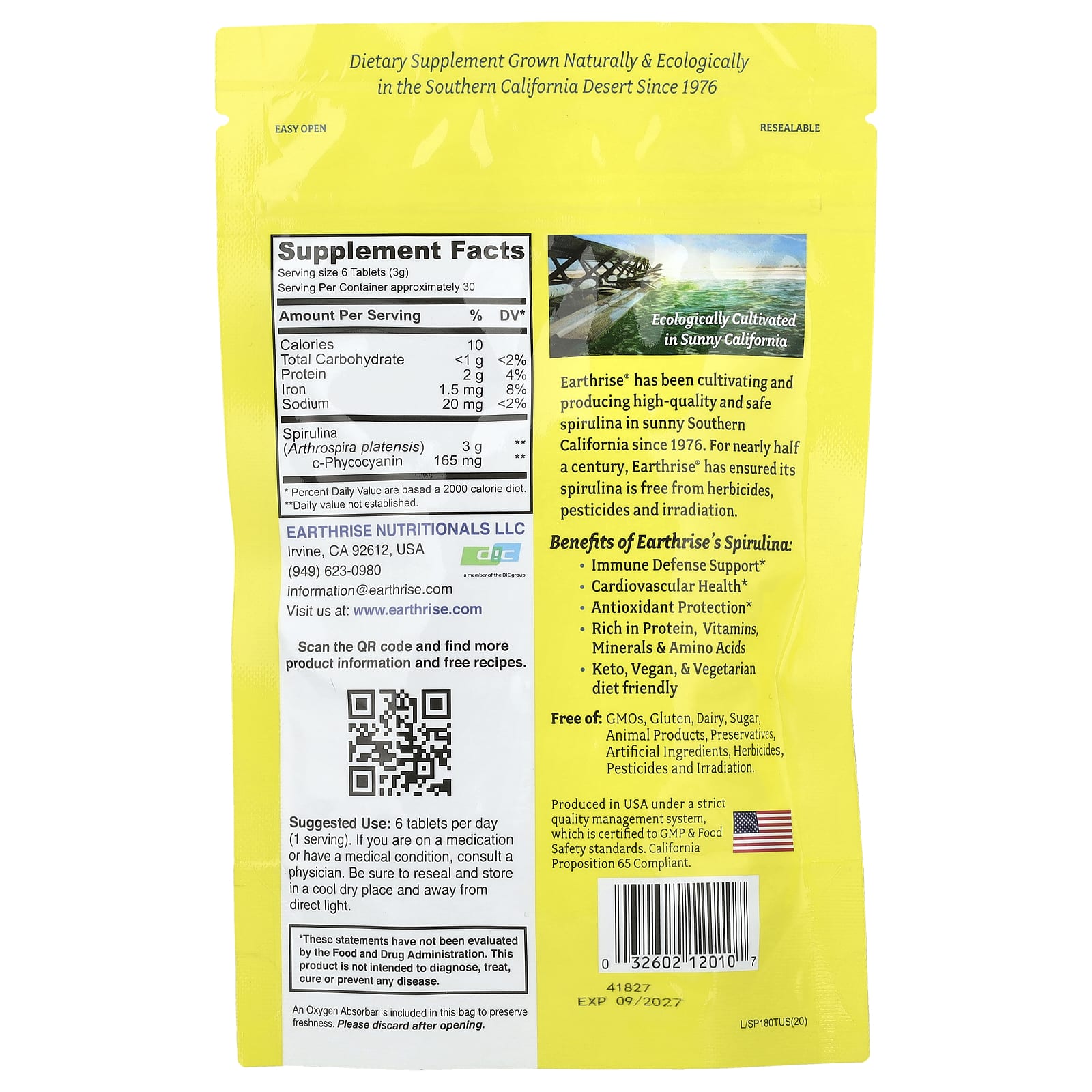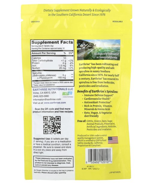 SuperfoodVegan FriendlyGluten FreeNon GMO Project VerifiedDietary SupplementKosherDairy FreeKeto FriendlyCalifornia Grown Spirulina Dietary Supplement Grown Naturally & Ecologically in the Southern California Desert Since 1976.Ecologically Cultivated in Sunny California​Earthrise® has been cultivating and producing high-quality and safe spirulina in sunny Southern California since 1976. For nearly half a century, Earthrise® has ensured its spirulina is free from herbicides, pesticides and irradiation. Benefits of Earthrise’s Spirulina: Immune Defense Support Cardiovascular HealthAntioxidant Protection Rich in Protein, Vitamins, Minerals & Amino Acids Keto, Vegan, & Vegetarian Diet Friendly