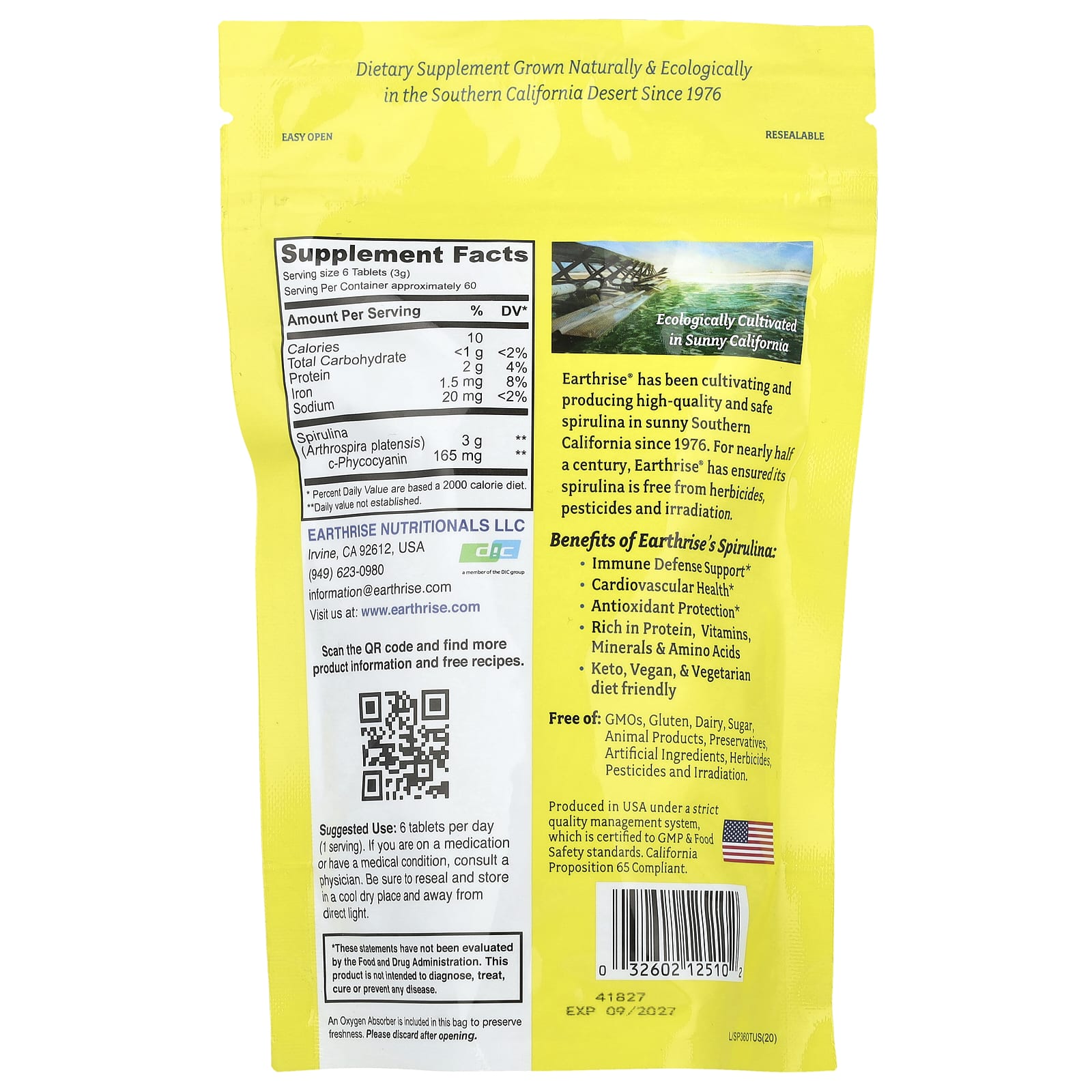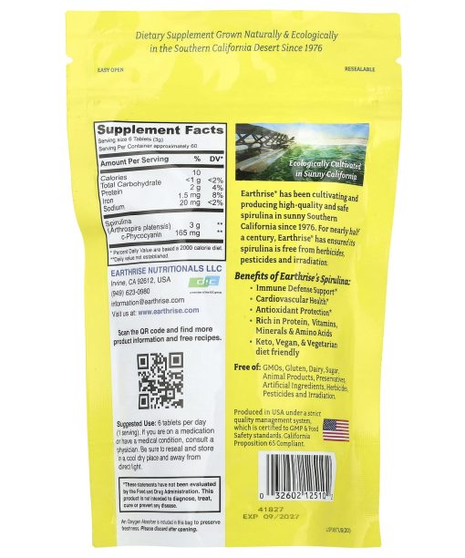 SuperfoodVegan FriendlyGluten FreeNon GMO Project VerifiedDietary SupplementKosherDairy FreeKeto FriendlyCalifornia Grown Spirulina Dietary Supplement Grown Naturally & Ecologically in the Southern California Desert Since 1976. Ecologically Cultivated in Sunny CaliforniaEarthrise® has been cultivating and producing high-quality and safe spirulina in sunny Southern California since 1976. For nearly half a century, Earthrise® has ensured its spirulina is free from herbicides, pesticides and irradiation. Benefits of Earthrise’s Spirulina: Immune Defense SupportCardiovascular HealthAntioxidant ProtectionRich in Protein, Vitamins, Minerals & Amino AcidsKeto, Vegan, & Vegetarian diet friendly