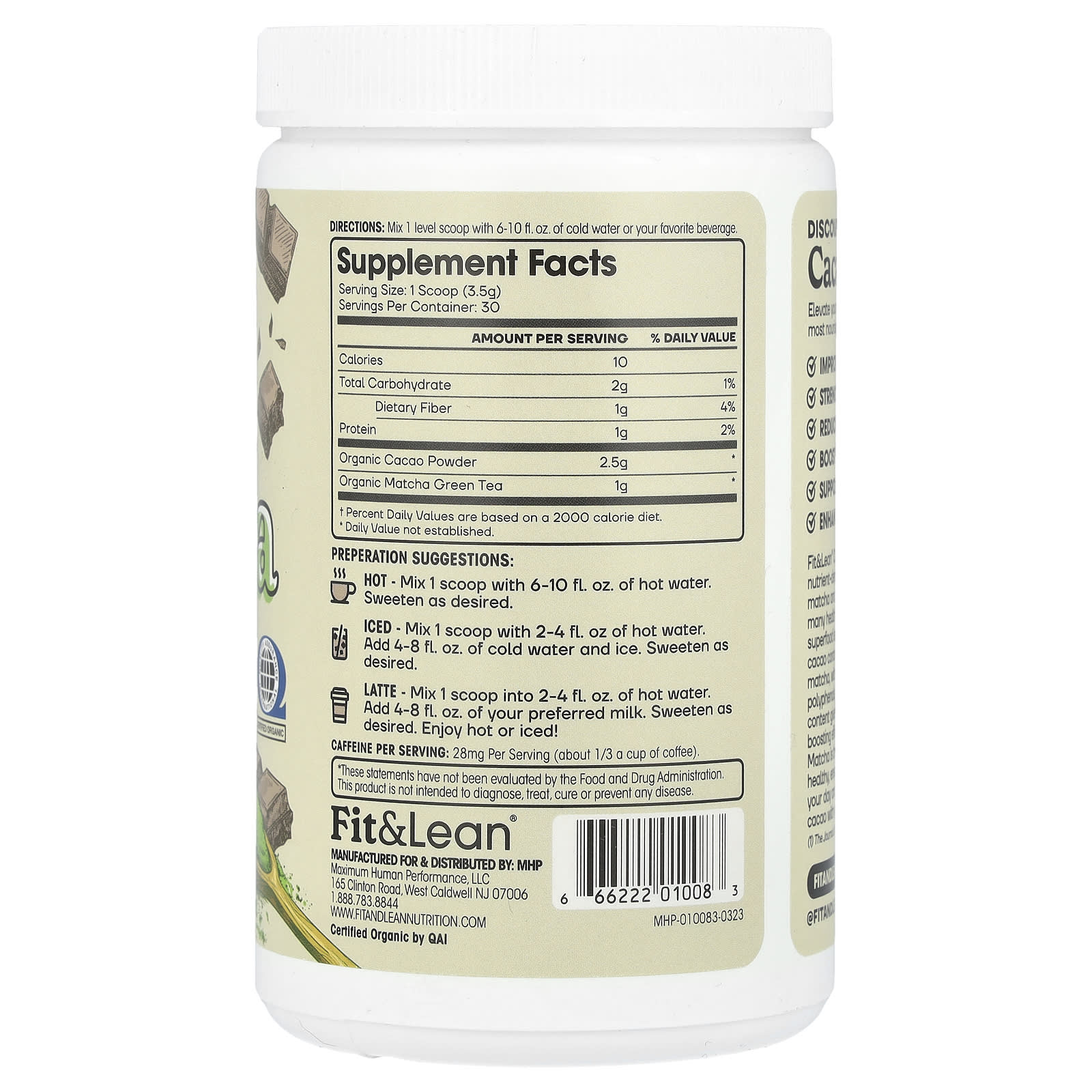 Elevate Your Body & MindCertified Organic QAIMake Fit HappenNature’s Most Powerful SuperfoodsCeremonial Grade MatchaRaw Dark Cacao100% Certified OrganicDietary SupplementDiscover Cacao MatchaElevate you daily matcha with cacao, nature’s most nourishing superfood.Improve Focus & MemoryStrengthen Immune SystemReduce InflammationBoost Energy & MetabolismSupports Cardiovascular HealthEnhance Mood & Well-BeingFit&Lean® Cacao Matcha is a delicious, nutrient-dense blend of organic ceremonial grade matcha and raw organic cacao. Yes, matcha has many health benefits, but nature’s most true superfood is cacao. Packed with nutrients, raw cacao contains even more antioxidants than matcha, with 12x more flavonoids and 3x as many polyphenols.(1) Cacao’s extremely high flavonoid content gives it powerful cognitive and mood boosting effects. Our antioxidant-rich Cacao Matcha is the perfect dynamic duo to keep you healthy, energized, and mentally sharp. Elevate your day and enjoy the rich flavorful taste of cacao with your matcha.(1) The Journal of Agricultural and Food Chemistry, 2003.