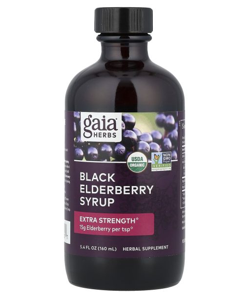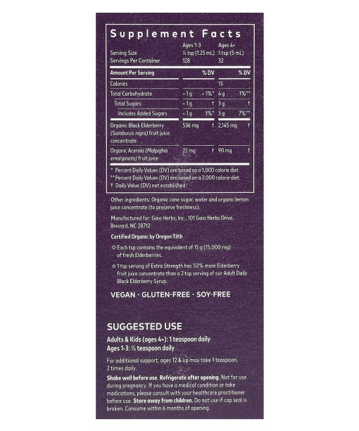15 g Elderberries Per TSP♦Extra Strength ☆Promotes Immune Health For The Whole Family USDA OrganicNon GMO Project Verified Herbal SupplementCertified Organic by Oregon TilthSoy-Free VeganGluten FreeCertified B Corporation The Gaia Difference Great-tasting Made from organic ingredients Nothing artificial No added flavors or colorsConnecting People, Plants & Planet Purity: All products are screened for pesticides, microbes & heavy metals. Potency: Concentrated fruit juices provide a delicious & convenient way to get your daily dose of herbs. Integrity: See the proof at meetyourherbs.com, the world’s first herb traceability platform.The Power of Transparency The way your herbs are grown matters. Each Gaia Herbs product is printed with a unique Meet Your Herbs® code, empowering you to discover where and how the herbs were cultivated and see validation of your product’s purity and potency.​♦Each tsp contains the equivalent of 15 g (15,000 mg) of fresh Elderberries.☆1 tsp serving of Extra Strength has 50% more Elderberry fruit juice concentrate than a 2 tsp serving of our Adult Daily Black Elderberry Syrup.