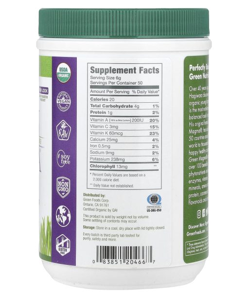 Dr. Hagiwara’s Original Formula Since 1969Organic & Raw USDA OrganicEnergizeDetoxifyRegulateRejuvenateDietary SupplementNatural Vegan ProductSoy FreeNon GMOKosherGluten FreeCertified Organic by QAIEvery Batch is Third Party Lab Tested for Purity, Safety and MorePerfectly Balanced Green NutritionOver 40 years ago, Dr. Hagiwara discovered that organic young barley grass is the most nutritionally balanced food in nature. His original formula, Green Magma®, has sold in over 50 countries around the world to thousands of happy healthy customers. Green Magma® contains over 100 beneficial phytonutrients including enzymes, vitamins, minerals, amino acids, protein, carotenoids, flavonoids and chlorophyll.Nourish your body the way nature intended!Chlorophyll encourages gentle detoxification, supports healthy cells, and balances pH levels. Active Enzymes promote healthy digestion, energy production and boost metabolism. Antioxidants support immune function, healthy aging, and fight free radicals. The Result: increased energy levels, improved digestion, enhanced mental acuity and better looking hair, skin and nails.
