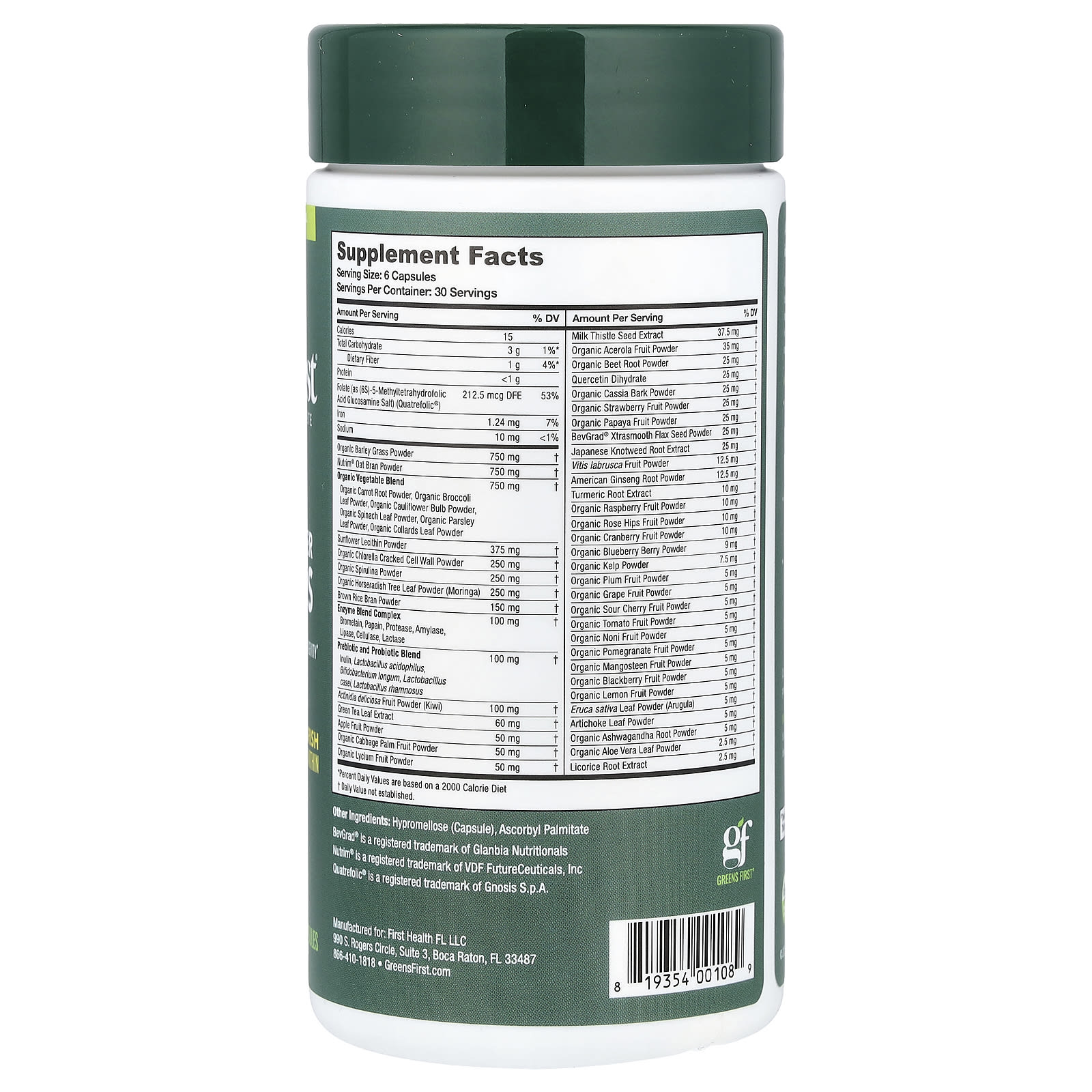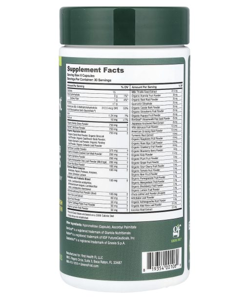 The Original VeganGluten FreeDairy FreeCaffeine FreeNo Added Sugar25 Years of Great TasteEnergy – Digestion – Immunity – Longevity49 Super Foods#1 Doctor RecommendedNourish From WithinDietary SupplementcGMP Facility Certified3rd Party TestedNon GMOA nutrient-rich, antioxidant superfood in convenient capsules. Greens First® Capsules give you the benefit of balanced whole nutrition with 49 superfoods, pre and probiotics, digestive enzymes, folate, and fiber in easy-to-swallow capsules to nourish your body and optimize your health. A Nutritional Powerhouse We put the SUPER in superfoods. Each serving of Greens First® Capsules contains 49 powerful superfoods – dozens of organic fruits and vegetables with a wide variety of phytonutrients and antioxidants in every serving!Actively support gut health with probiotics, digestive enzymes, and inulin, a prebiotic soluble fiber that promotes healthy bowel movements.Nourish and balance your whole body. Greens First® Capsules are part of a healthy diet supplying daily nutrition that you may otherwise not be getting. Our exclusive formula revitalizes and alkalizes with a daily serving of nutritional goodness.