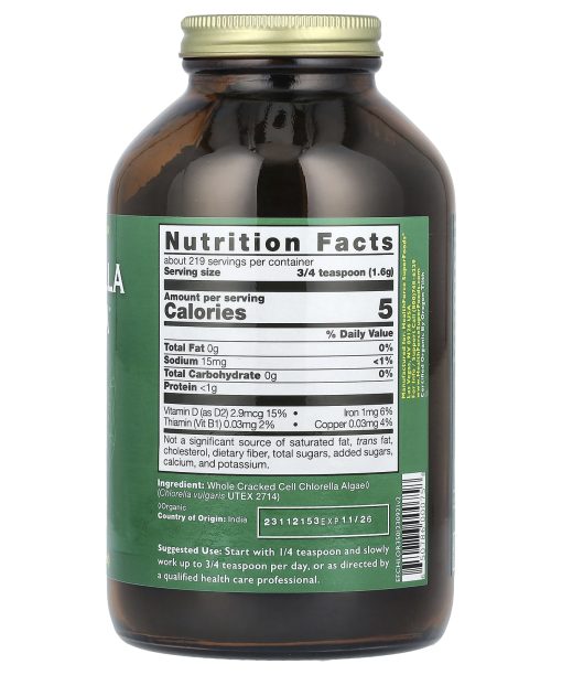 whole cracked cell chlorella algae* (Chlorella vulgaris UTEX 2714).*Organic