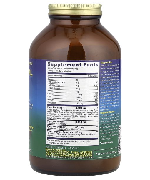 Grasses AlgaeLand VegetablesSea VegetablesEnzymesPerfect Companion to Earth Broth®Nourishing – Foundational – Hard-Core Broad-Spectrum Green Superfood ComplexDietary SupplementOTCOCertified VeganCertified Gluten-FreeTruGanic™ SourcingEco FacilityVegan EthicsLab VerifiedKosher PareveCertified Organic by Oregon TilthYou Deserve It!Vitamineral Green® is an extremely potent, hard-core, green superfood complex, combining the most nutrient-dense superfoods on the planet in an easy-to-use powder. Features alkalizing grasses and grass juices, freshwater algae, and sea vegetables abundant in iodine and trace minerals. Our unique formula offers a diverse blend of plant foods not commonly found in our modern diet. By including bio-diverse superfoods like nettles, horsetail, and moringa leaf, as well as non-green powerhouse superfoods like amla berry and ginger root, we’ve created a broad-spectrum, bio- nutritive superfood complex that is truly one of a kind. Vitamineral Green is actual food, free of synthetic/isolated nutrients. No binders, fillers, or added sweeteners. Green Focused: Not diluted with grains, seeds/chia/flax, fibers, fruits, or fillers. HealthForce SuperFoods® is an independently owned and operated whole food botanical company. We offer a diverse and truly effective product line inspired by the incredible symbiotic power of plants. Our mission is fueled by a passion for purity with a strong commitment to compassion and integrity. We are proud to offer clean, ethically produced products designed to help people realize their full potential.”I wish you great health and happiness always!” Dr. Jameth Sheridan – Naturopath and Hard-Core Herbal Medicine Researcher