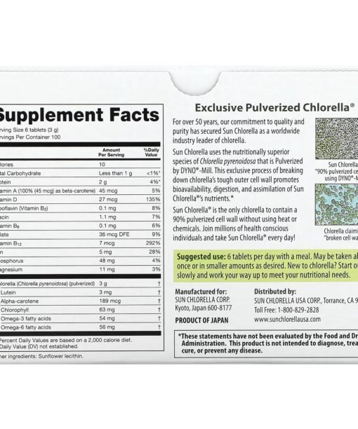 Sun Chlorella® is made from pure pulverized Chlorella pyrenoidosa. This heat-sealed bag with a special food grade lining is designed to help keep out light and moisture to maintain the potency of the nutrients in each tablet. The result is the most nutritious and digestible chlorella possible.