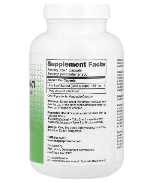 100% PureNo FillersNo ChemicalsDietary SupplementSeagate is the actual manufacturer of this product. Seagate workers harvest these leaves from our local trees each winter. The olive trees are grown without the use of any chemicals or pesticides.Extraction: Seagate uses a freshwater, mechanical concentration process without the use of any chemical, solvent, or high temperature. There are over 8 phytochemicals besides oleuropein that are found in olive leaves, and also in olive oil, and in the bark and roots of the olive tree. Seagate Olive Leaf Extract does not alter the delicate structure and balance of these important natural phytochemicals which have allowed this plant to survive in nature unchanged in over 10,000 years.Purity: Each batch of extract is tested by independent laboratories. There is no filler or excipient in this or any Seagate product.Oleuropein controversy: Most “manufacturers” of olive leaf extract do not actually process their own products, but are just resellers that purchase from other suppliers, and probably have never seen an olive tree growing in nature. In order to distinguish their product’s potency and quality from their competitors, most of these companies specify their oleuropein standardized to some level on their labels. However, the separation and concentration of oleuropein has no effect on increasing the potency of Olive Leaf Extract, and can actually cause the product to become inactive.Dietary support may be needed to protect you against resistant strains of microorganisms. Seagate Olive Leaf Extract contains natural phytochemicals, including oleuropein, to help support good health.
