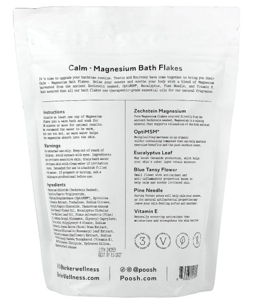 Three Full Uses Inside Every BagVeganCruelty-FreeAll NaturalPremium IngredientsNo Synthetic Dyes or FragrancesIt’s time to upgrade your bathtime routine. Travis and Kourtney have come together to bring you their Calm – Magnesium Bath Flakes. Relax your senses and soothe your body with a blend of Magnesium harvested from the ancient Zechstein seabed, OptiMSM®, Eucalyptus, Pine Needle, and Vitamin E. Rest assured that all our bath flakes use therapeutic-grade essential oils for our natural fragrances.Zechstein Magnesium Pure Magnesium flakes sourced directly from the ancient Zechstein seabed; Magnesium is a calming mineral that supports relaxation of the body and mind. OptiMSM® Methylsulfonylmethane is an organic sulfur-containing compound that can help maximize exercise benefits and the post-workout reset. Eucalyptus Leaf May boost Ceramide production, which helps your skin’s outer layer retain moisture. Blue Tansy Flower Small flower with antioxidant and anti-inflammatory properties known to help calm and soothe irritated skin. Pine Needle Earthy forest notes will help calm your senses, as its natural antibacterial properties may leave your skin feeling softer and smoother. Vitamin E Naturally occurring antioxidant that moisturizes and strengthens the skin barrier.