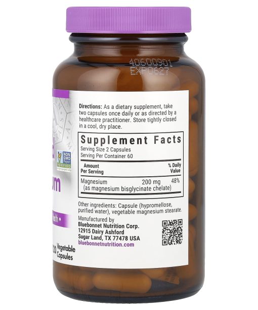 Non GMO Project Verified Relaxation, Immune & Heart Health Dietary SupplementAlbion MineralsVeganGluten FreeKosher ParveBluebonnet’s Chelated Magnesium Bisglycinate Vegetable Capsules are formulated with 200 mg per serving of elemental magnesium from fully reacted magnesium bisglycinate, an amino acid chelate mineral from Albion. Magnesium supports energy production and is critical for enzyme function.