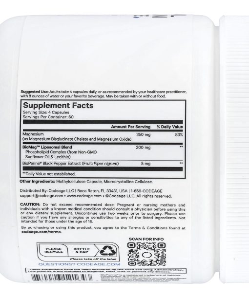 Bisglycinate Chelate Phospholipid ComplexBioavailableDietary SupplementBioPerine®Essential PhospholipidsVeganNon-GMOSoy-FreeDairy-FreeGluten-FreecGMP Certified ManufacturingFeel DifferentCodeage Liposomal Magnesium glycinate formula provides 350 mg of magnesium bisglycinate chelate per serving.This formula includes a liposomal magnesium mineral blend with non-GMO phospholipids from sunflower oil and sunflower lecithin for a plant-based supplement.Codeage Liposomal Magnesium capsules supplement features BioPerine® black pepper fruit extract.