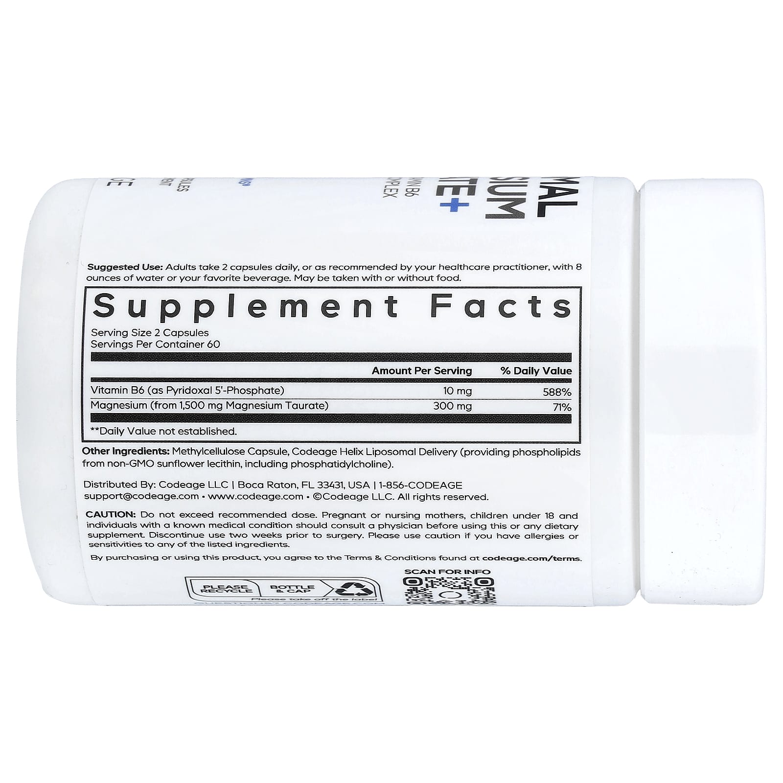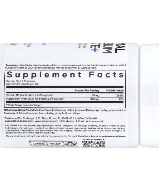 Magnesium – Vitamin B6Phospholipid ComplexBeyond Vitamins®Dietary SupplementEssential PhospholipidsVeganNon-GMOSoy-FreeDairy-FreeGluten-FreecGMP Certified ManufacturingFeel DifferentCodeage Liposomal Magnesium Taurate+ combines magnesium and Vitamin B6 in a specialized formula designed to support everyday needs.Codeage Liposomal Magnesium Taurate+ offers a balanced blend of magnesium and taurine, complemented by the presence of Vitamin B6 in a liposomal structure, providing a refined approach to supplementing your routine.Elevate your daily routine with this carefully selected combination of ingredients, including magnesium taurate and Vitamin B6. These components are paired with liposomes, allowing for a modern formulation designed with thoughtful precision.