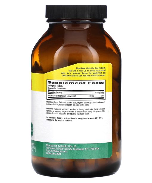 Established 1971Fully Reacted400 mg Per ServingCertified Gluten FreeSupports Heart HealthPromotes Healthy Bone and Muscle FunctionDietary SupplementKosher ParveCertified B Corporation— Our Pledge of Integrity —AuthenticityCleanlinessFreshnessConsistencyAccuracyCountry Life Magnesium Glycinate is fully reacted with an amino acid chelate. It offers a bioavailable source of magnesium to the body. Magnesium is needed for more than 300 biochemical reactions on the body and it helps to relax muscles. It can also support energy production, cardiovascular function, immune health and strong bones.YESCertified Gluten-Free by GFCO.orgNOGMO’sYESCertified Vegan by the AVANOYeast, Corn or WheatYESRecyclable PackagingNOSoy, Milk or SaltYESManufacturing Supports Wind PowerNOSugar or Preservatives YESKosher ParveNOArtificial Colors, Flavors or SweetenersNOMagnesium StearateThis product has been manufactured at a GMP Registered facility.
