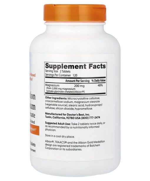 Science-Based Nutrition™Lysinate Glycinate100% ChelatedMuscle Relaxation & Sleep SupportAlbion® MineralsDietary SupplementNon-GMO · Gluten Free · Soy Free · VeganAt Doctor’s Best, our high absorption magnesium is the ultimate multitasker, crucial for a range of bodily functions. Our specialized magnesium formula provides essential support for muscles, nerves, sleep quality, and maintaining a balanced mood. Essential in 600 enzyme systems that support biochemical functionsUp to 6x better absorbed than other forms of magnesiumTRAACS® chelate technology from Albion®
