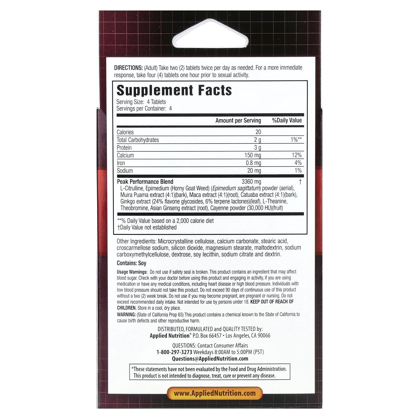 Do not use if safety seal is broken. This product contains an ingredient that may affect blood sugar. Check with your doctor before using this product and engaging in activity, if you are using medication or have any medical conditions, including heart disease or high blood pressure. Individuals with low blood pressure should not take this product. Do not exceed 90 days of continuous use of this product without a two (2) week break. Do not use if you may become pregnant, are pregnant or nursing. Do not exceed recommended daily intake. Not intended for use by persons under 18. Keep out of reach of children. Store in a cool, dry place. WArning: (State of California Prop 65) This product contains a chemical known to the State of California to cause birth defects and other reproductive harm.