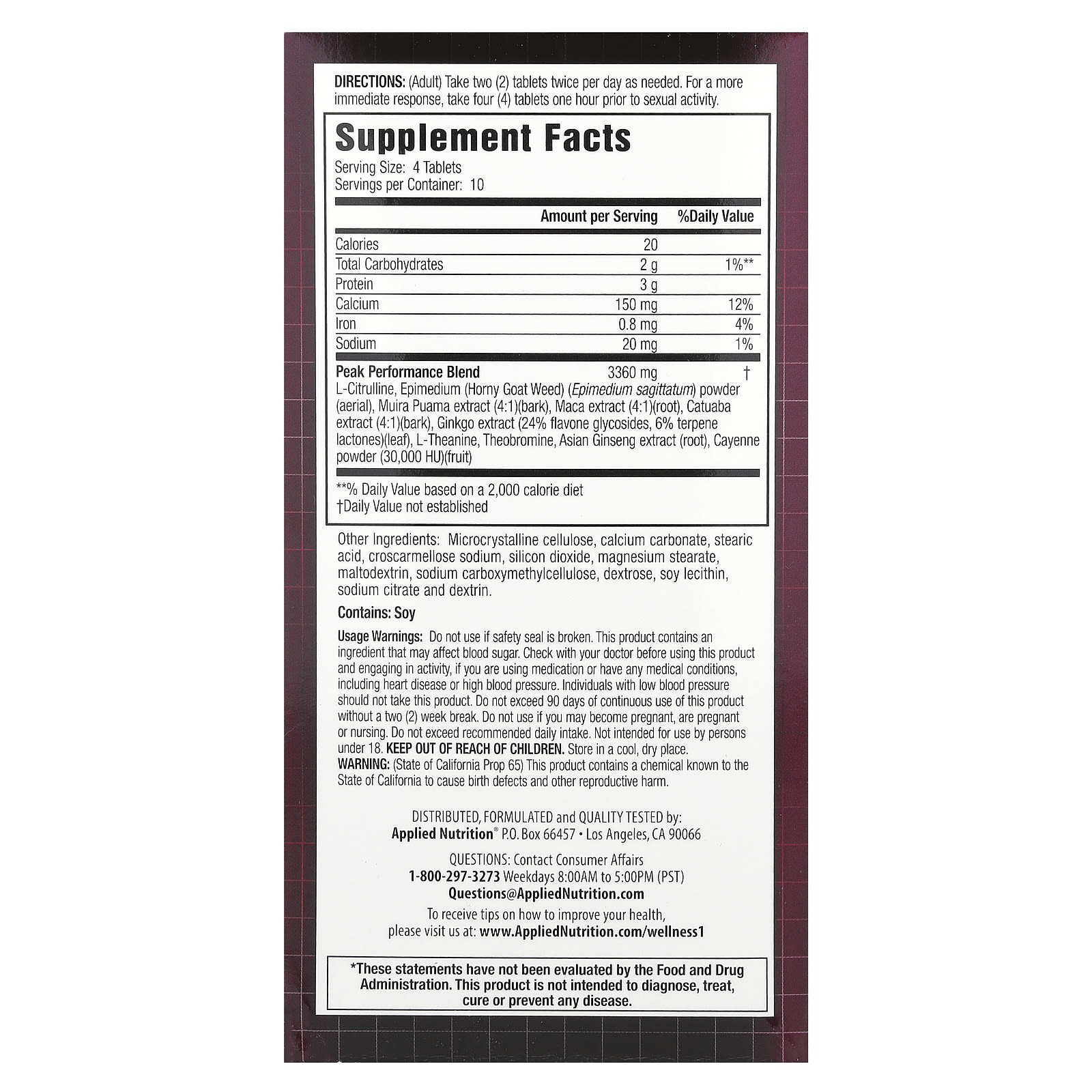 Do not use if safety seal is broken. This product contains an ingredient that may affect blood sugar. Check with your doctor before using this product and engaging in activity, if you are using medication or have any medical conditions, including heart disease or high blood pressure. Individuals with low blood pressure should not take this product. Do not exceed 90 days of continuous use of this product without a two (2) week break. Do not use if you may become pregnant, are pregnant or nursing. Do not exceed recommended daily intake. Not intended for use by persons under 18. Keep out of reach of children. Store in a cool, dry place. (State of California Prop 65) This product contains a chemical known to the State of California to cause birth defects and other reproductive harm.
