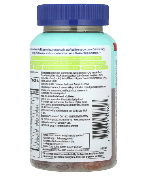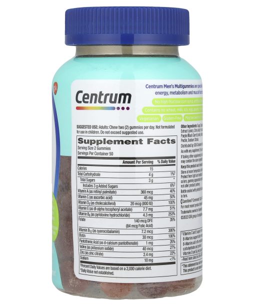 Gelatin-FreeSupports Immunity, Energy, Metabolism & Muscle Function†Non-GMONo Artificial Flavors or SweetenersNo High Fructose Corn SyrupNatural Flavor with Other Natural FlavorsMultivitamin/Multimineral SupplementVegetarianGluten FreeMay be Taken With or Without FoodCentrum Men’s Multigummies are specially crafted to support men’s immunity, energy, metabolism and muscle function with 11 essential nutrients. †Vitamins C and E support normal immune function. B-Vitamins support daily energy needs. B-Vitamins aid in the metabolism of fats, carbohydrates and proteins. Vitamins D and B& help support muscle function.