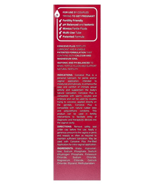 Supports Sperm QualityFor Use by Couples Trying to Get PregnantCa+Mg+pH BalancedMulti-Use TubeFertility FriendlyIsotonicMimics Fertile FluidsPatented FormulaClinical Studies Show 99% Viable SpermAfter 2 Hours Exposure to Conceive PlusConceive Plus Helps Create an Optimal Environment for SpermConceive Plus Fertility Lubricant has a unique patented formulation that contains both calcium and magnesium ions. Isotonic and ph balanced to mimic fertile fluids and support natural fertility. Indications: Conceive Plus is a personal lubricant, for, penile and/or vaginal application, intended to moisturize and lubricate, to enhance the ease and comfort of intimate sexual activity and supplement the body’s natural lubrication. Conceive Plus is compatible with sperm, oocytes and embryos and can be used by couples trying to conceive, applied directly on the genitals. Conceive Plus is compatible with natural rubber latex and polyurethane condoms. This product can be used in fertility interventions to facilitate entry of diagnostic and therapeutic devices into the vaginal cavity.