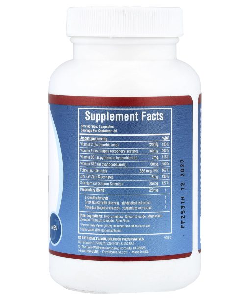 Scientifically ValidatedDo Something Good for Yourself Each DayDietary SupplementNo Artificial Flavor, Color or PreservativesA premium formula of l-carnitine, ferulic acid, antioxidants, vitamin c and e, green tea and selenium, zinc and b vitamins essential for male fertility health.A scientifically validated nutritional blend that enhances fertility health. L-Carnitine is an amino acid that has been shown to help produce healthy, active sperm. Ferulic acid, an antioxidant found in Dong quai, has been shown to help sperm quality. The antioxidants – vitamins C and E, green tea, and selenium, support overall reproductive health. Zinc and B vitamins (B6, B12, and folate) help maintain proper male hormone metabolism, sperm formation and motility.