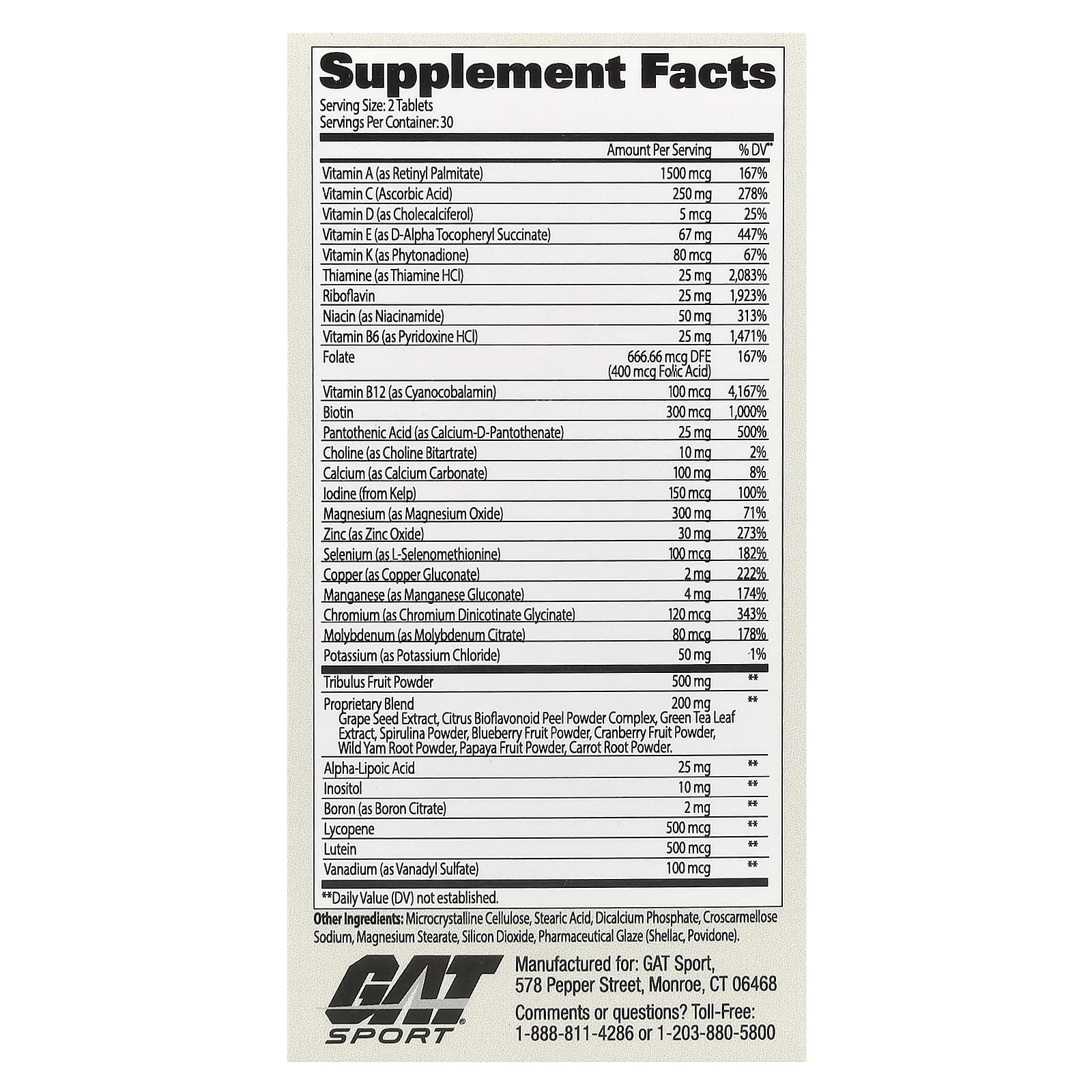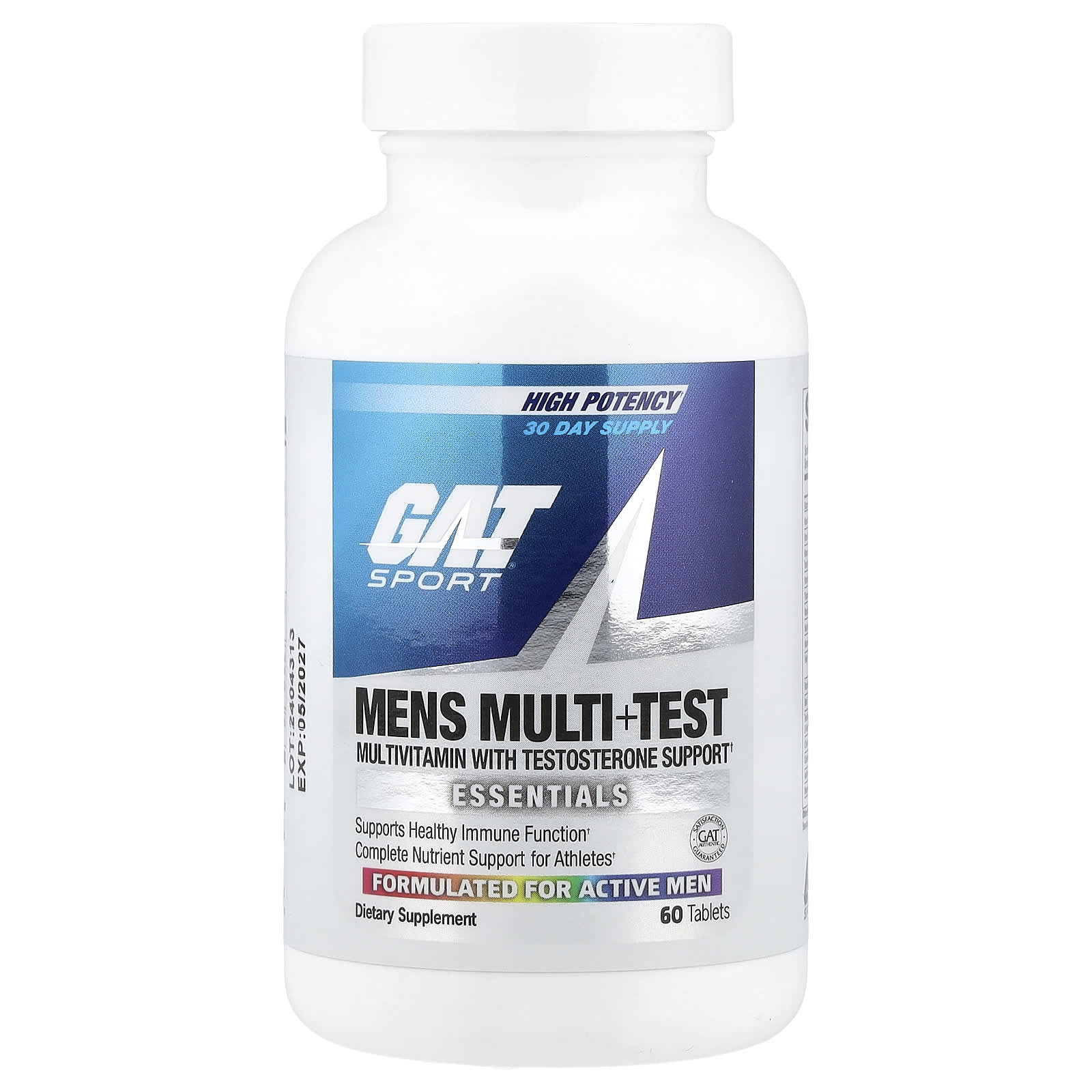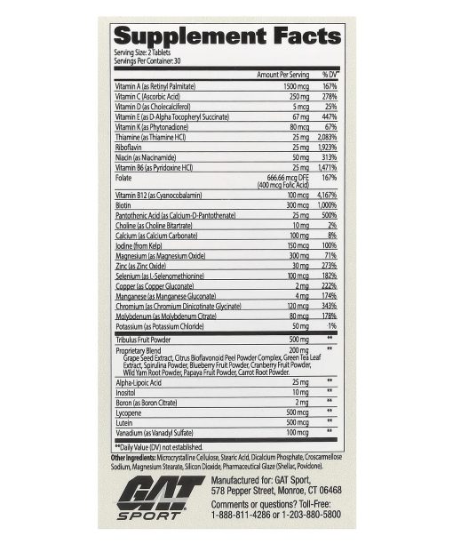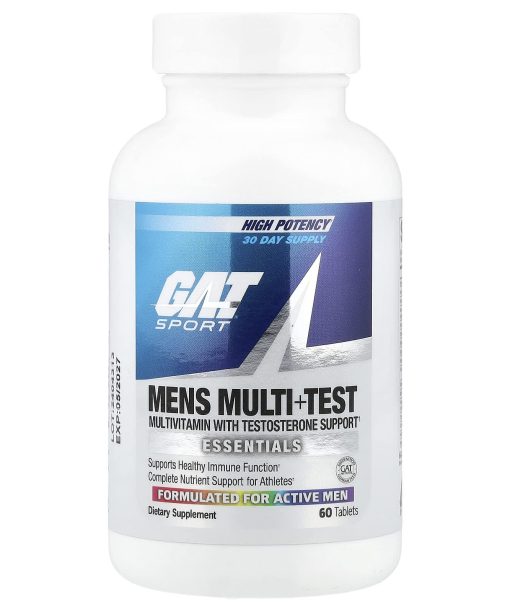Multivitamin with Testosterone Support EssentialsSupports Healthy Immune FunctionComplete Nutrient Support for AthletesGAT – Authentic – Satisfaction Guaranteed Formulated for Active Men Dietary SupplementBoost TestImmunity Energy GAT Men’s Multivitamin + Test Ultimate Performance VitaminMens Multi+Test is a complete vitamin, mineral and energy multivitamin with added men’s virility ingredient Tribulus Terristis. GAT Mens Multi offers athletes complete support for nutrient deficiencies they may need with an added virility and testosterone boost.