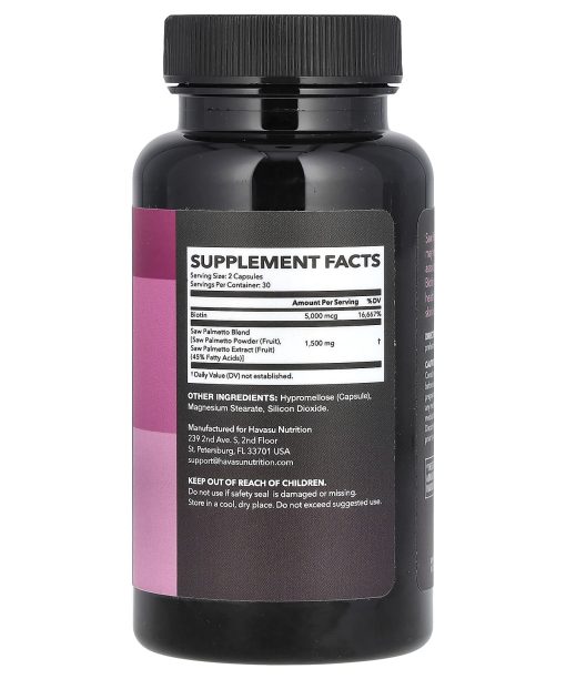 +5,000 mcg Biotin Hair, Skin & Nails Support Dietary Supplement 100% Vegan Non GMOSourced from a GMP Facility Saw Palmetto herbal extract may help regulate hair loss associated with aging. Biotin may help aid hair health and support healthy skin and nails.