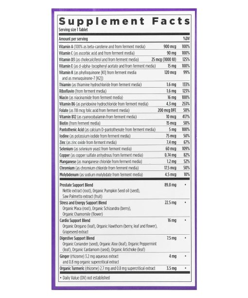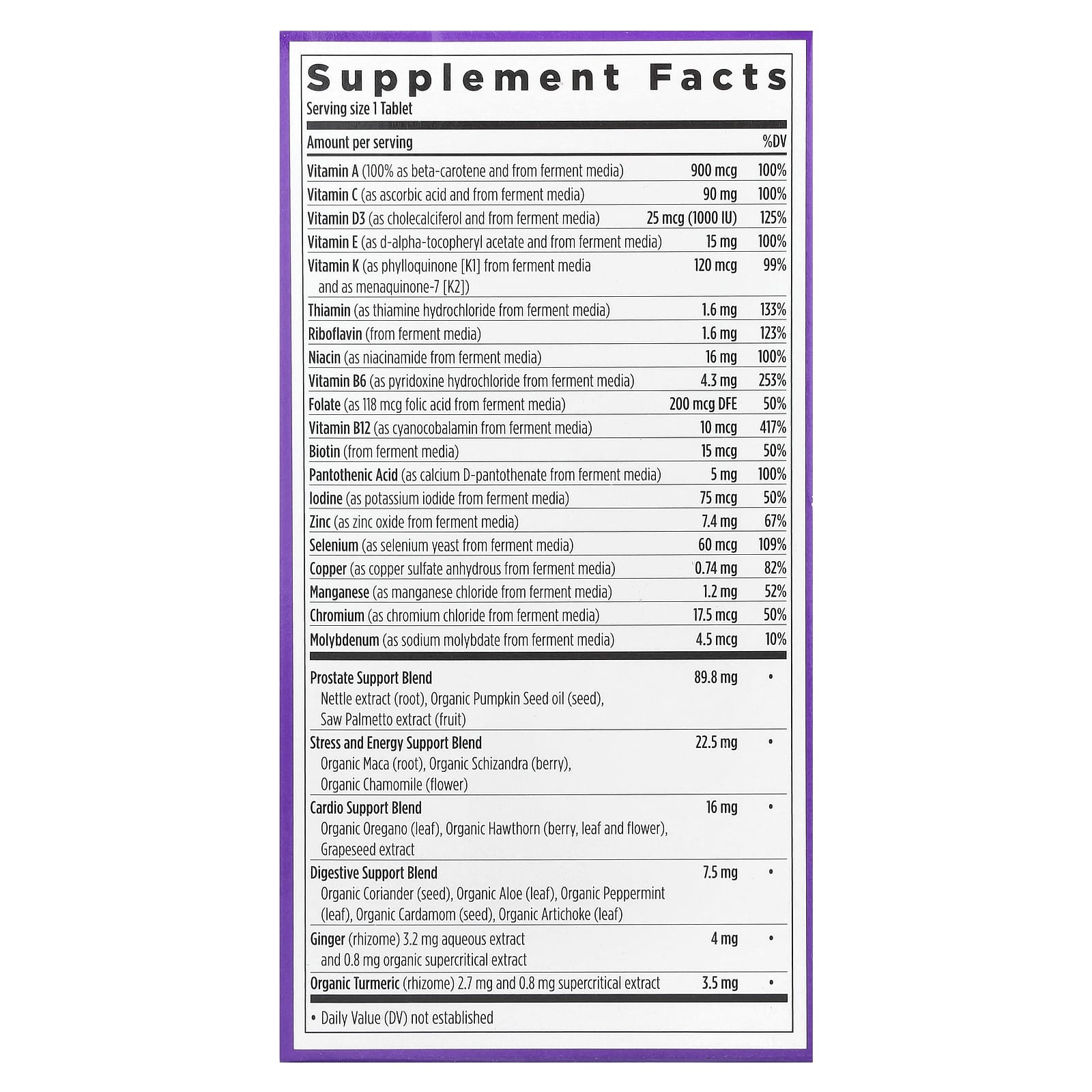 Est. 1982Formulated for AbsorptionMade with Organic Vegetables & HerbsNon GMO Project VerifiedCertified Gluten-Free by NSFKosherDietary SupplementCertified Organic by Where Food Comes From Organic100% VegetarianNo Artificial Flavors or ColorsCertified B CorporationWith Gratitude from VermontNutrition Crafted For: Immune, Heart & Prostate SupportThe Magic Inside: Essential nutrients your body can recognize, fermented & blended with superfood herbs including Saw Palmetto.Complete MultivitaminFor The Need of Men 40+ Expertly formulated to support the holistic health needs of men age 40 & beyond, with nutrients for brain, bone & eye support, stress & digestive support, and healthy hair, skin & nails.Immune & Prostate SupportFermented Zinc† and vitamins C & A support immune system function, while fermented Selenium helps support a healthy prostate.Heart HealthyVitamin D3 supports heart health, including healthy blood vessel support.Holistic HerbsInspired by tradition and grounded in science, advanced botanicals include Turmeric and  Hawthorn, plus Saw Palmetto. Absorb The Good Stuff We fine-tune the levels of each high-quality vitamin & mineral, choose types that work best with the body, and ferment key nutrients with probiotics and whole foods. †Not a sole source of this nutrient; a healthy diet is also important.
