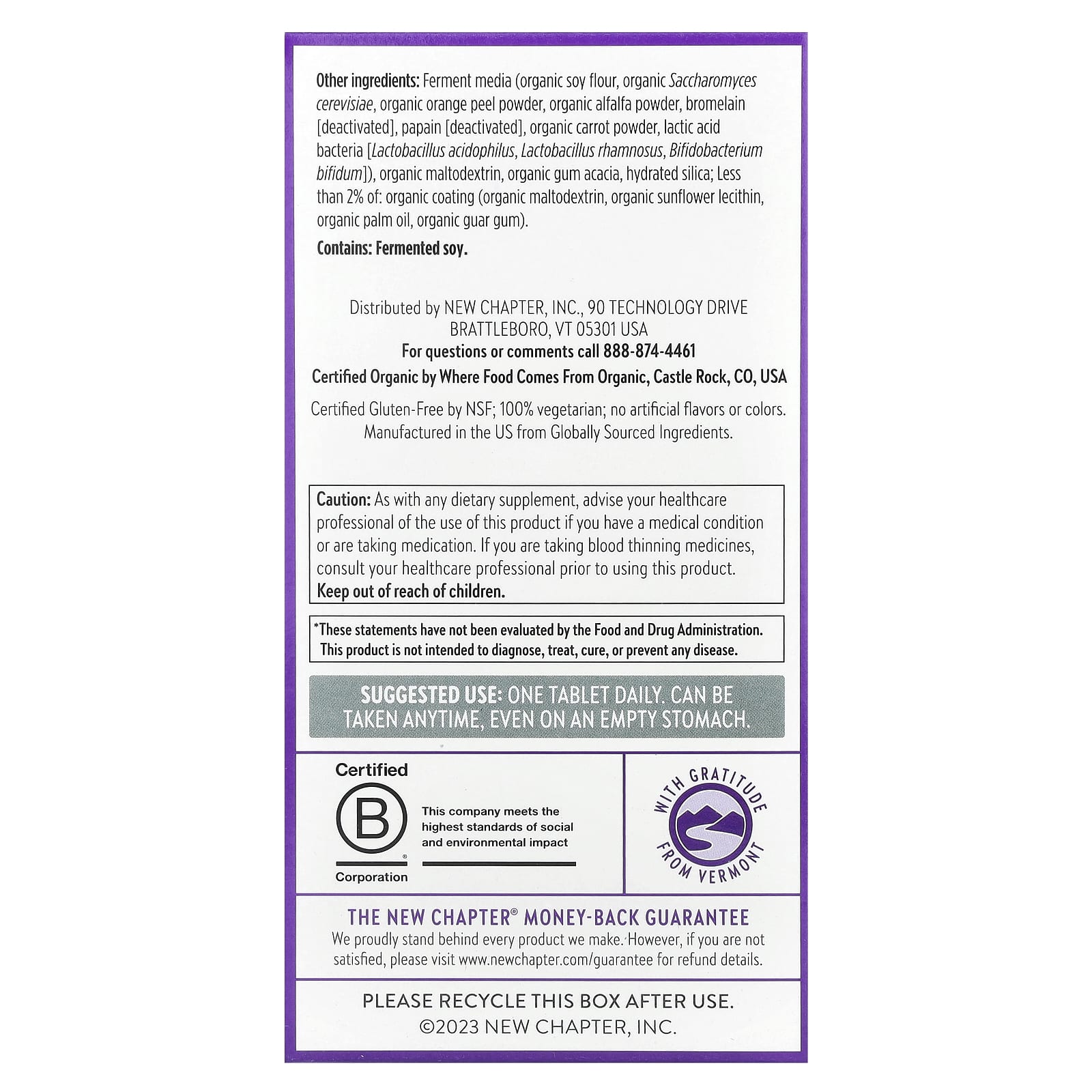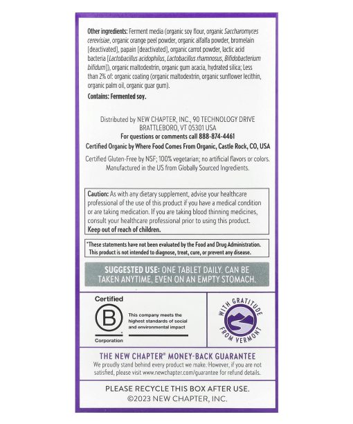 Ferment media (organic soy flour, organic Saccharomyces cerevisiae, organic orange peel powder, organic alfalfa powder, bromelain [deactivated], papain [deactivated], organic carrot powder, lactic acid bacteria [Lactobacillus acidophilus, Lactobacillus rhamnosus, Bifidobacterium bifidum]), organic maltodextrin, organic gum acacia, hydrated silica; Less than 2% of: organic coating (organic maltodextrin, organic sunflower lecithin, organic palm oil, organic guar gum). Contains: Fermented soy.Manufactured in the US from globally sourced ingredients.