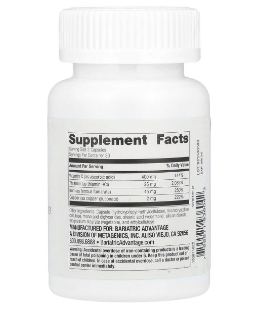 Iron 45 mgDietary SupplementThis Product is Gluten-Free and Vegetarian Bariatric Advantage® Iron capsule includes thiamin and copper, as well as vitamin C to aid iron absorption. It provides the minimum recommended daily amount of iron for individuals following RYGB, SG, and BPD/BPD-DS procedures as recommended by ASMBS.
