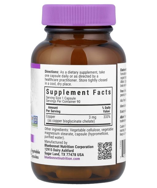 Non GMO Project Verified Brain & Immune HealthAlbion Minerals Dietary SupplementVeganKosher PareveGluten FreeBluebonnet’s Chelated Copper Vegetable Capsules are formulated with 3 mg of elemental copper from fully reacted copper bisglycinate, an amino acid chelate mineral from Albion. Copper is an essential element that is necessary for nervous system and immune health.
