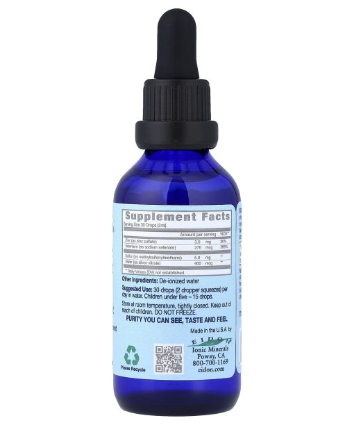 Mineral Dietary Supplement Purity You Can See, Taste and Feel It’s Not What You Take, It’s What You AbsorbNaturally DerivedGluten-free VeganNon-GMO100% BioavailableGentle on the StomachA blend of 4 minerals essential for a strong immune system.Eidon Immune Support: Zinc, selenium, sulfur, and silver play important roles supporting our immune system. This formulation provides you with an optimal blend of essential elements necessary to support a strong, healthy immune system.