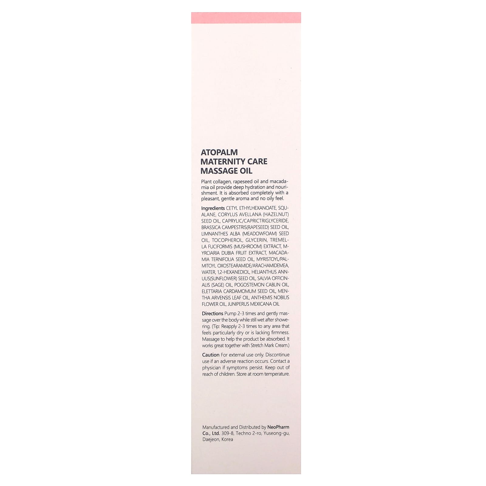 Since 2000 Multi Lamellar EmulsionECF Elemental Chlorine FreeMLE® (Multi-Lamellar Emulsion) is NeoPharm tech, perfectly recreates the structure of healthy skin.Atopalm Maternity Care Massage OilPlant collagen, rapeseed oil and macadamia oil provide deep hydration and nourishment. It is absorbed completely with a pleasant, gentle aroma and no oily feel.Treatment massage oil to help hydrate and soften the skin during/after pregnancy.