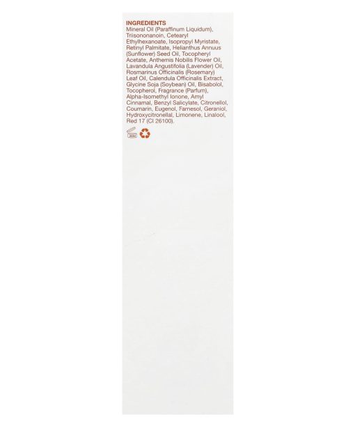 Mineral oil (paraffinum liquidum), triisononanoin, cetearyl ethylhexanoate, isopropyl myristate, retinyl palmitate, helianthus annuus (sunflower) seed oil, tocopheryl acetate, anthemis nobilis flower oil, lavandula angustifolia (lavender) oil, rosmarinus officinalis (rosemary) leaf oil, calendula officinalis extract, glycine soja (soybean) oil, bisabolol, tocopherol, fragrance (parfum), alpha-isomethyl lonone, amyl cinnamal, benzyl salicylate, citronellol, coumarin, eugenol, farnesol, geraniol, hydroxycitronellal, limonene, linalool, red 17 (ci 26100).