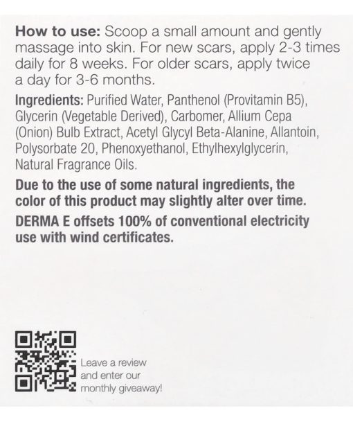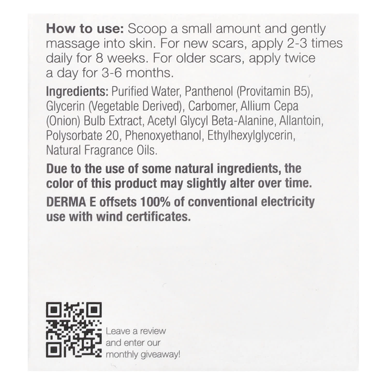 TherapeuticEco-Ethical100% VeganSoy-FreeDoctor DevelopedPanthenol & AllantoinDiminishes Visibility of ScarsDermatologist RecommendedLeaping Bunny®; Cruelty-FreeGluten FreeKiss scars goodbye.This non-oily gel is proven to significantly improve scar texture, color and overall appearance for softer, healthier-looking skin.Panthenol, Allantoin and Onion Bulb Extract help to hydrate, soothe and encourage self-healing. Scar Gel can also be used to soothe burns, sunburns, and tattoos as well as help to improve the appearance of stretch marks.Ethical BeautyClean, effective and dermatologist recommended, we are committed to your skin health, well-being and the natural environment. That’s the DERMA E difference.Since 1984, we are committed to skin health and safety:No Parabens No Phthalates No Formaldehyde No PetrolatumNo Sulfates No Mineral Oils No Artificial Colors No Artificial Fragrances