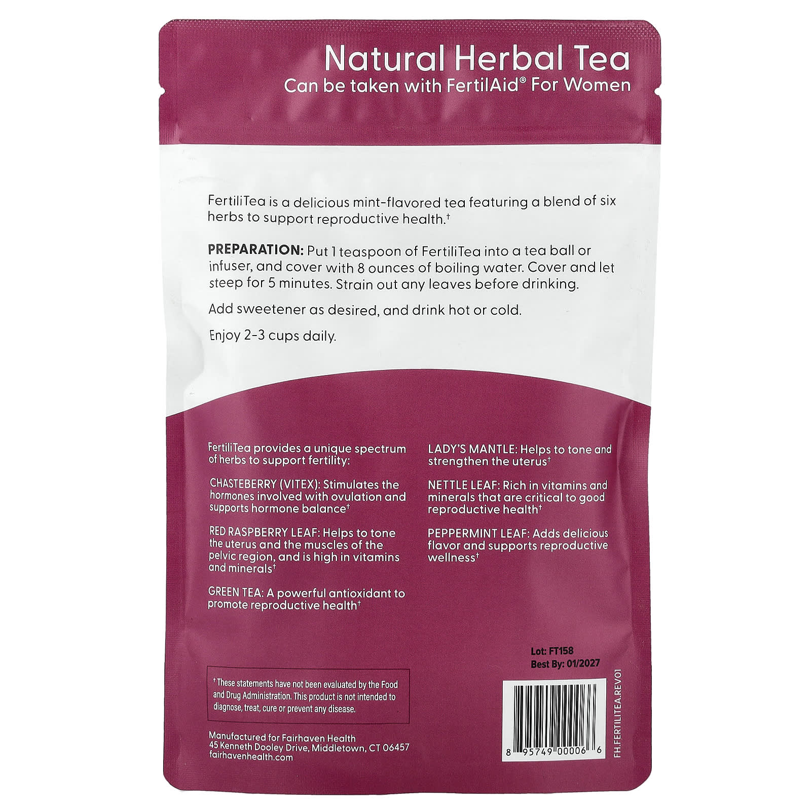 Can be Taken With FertilAid® for WomenNatural Herbal Tea to Support Female Reproductive HealthSpecial Fertility Blend of Organic and Wildcrafted Herbs, Including Chaste Tree Berry, Red Raspberry Leaf and Green TeaFertiliTea is a delicious mint-flavored tea featuring a blend of six herbs to support reproductive health.FertiliTea provides a unique spectrum of herbs to support fertility: Chasteberry (Vitex): Stimulates the hormones involved with ovulation and supports hormone balanceRed Raspberry Leaf: Helps to tone the uterus and the muscles of the pelvic region, and is high in vitamins and mineralsGreen Tea: A powerful antioxidant to promote reproductive healthLady’s Mantle: Helps to tone and strengthen the uterusNettle Leaf: Rich in vitamins and minerals that are critical to good reproductive healthPeppermint Leaf: Adds delicious flavor and supports reproductive wellness