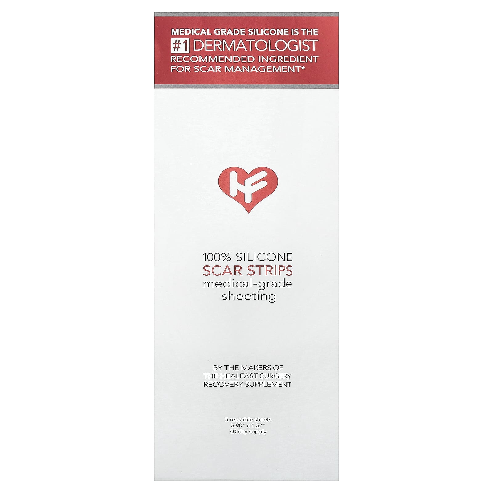 Medical Grade Silicone is The #1 DermatologistRecommended Ingredient For Scar Management*Medical-Grade Sheeting By The Makers of The Healfast Surgery Recovery Supplement 5.90″ x 1.57″40 Day Supply Features: Advanced crosspolymer formulation Safe and non-toxic Comfortable and easy to use ReusableSuitable for all skin types and tones Colorless, odorless and breathable Self-adhesive Crafted by DoctorsAdvanced Physician-formulated non-invasive scar strips specifically designed to mitigate scar formation and manage existing scars from surgery, injury, acne, and damaged skin.The advanced medical-grade silicone in our physician formulated scar strips has been clinically studied to improve the appearance of raised and discolored scar tissue and create a natural barrier to minimize overproduction of collagen which results in scars that are flatter, softer, and less visible with consistent use.°Intended use: Silicone sheeting is intended for use in the management of closed hyperproliferative (hypertrophic and keloid) scars.*Of U.S physicians surveyed by an independent market research firm.ºBerman, B. et al; Dermatologic Surgery; yr: 2007 vol: 33 iss: 11 pg: 1291 – 1303