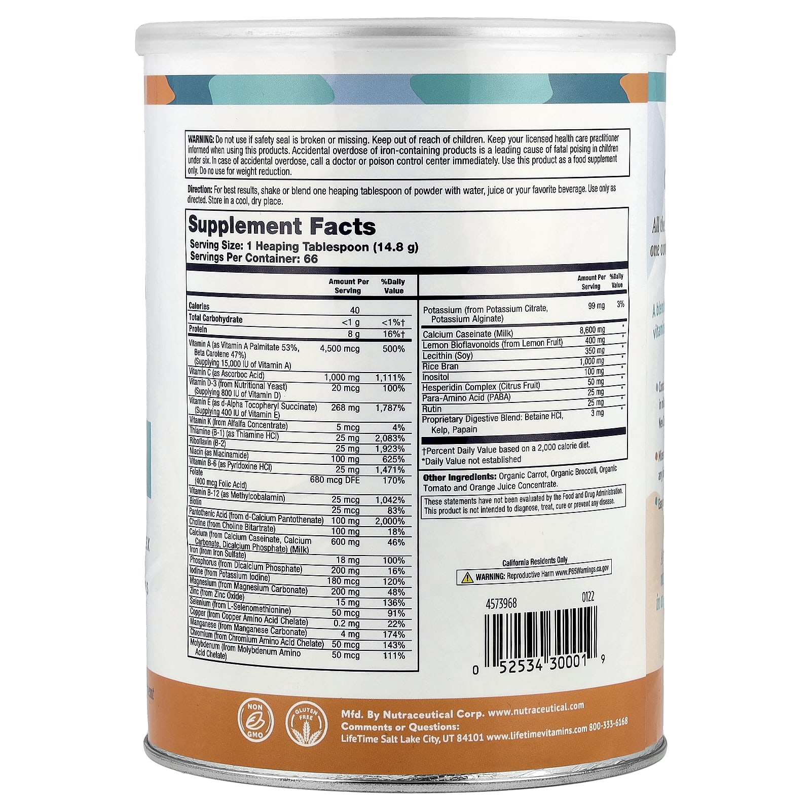 Do not use if safety seal is broken or missing. Keep out of reach of children. Keep your licensed health care practitioner informed when using this products. Accidental overdose of iron-containing products is a leading cause of fatal poising in children under six. In case of accidental overdose, call a doctor or poison control center immediately. Use this product as a food supplement only. Do no use for weight reduction.Store in a cool, dry place. California residents only: Reproductive harm. Prop 65.
