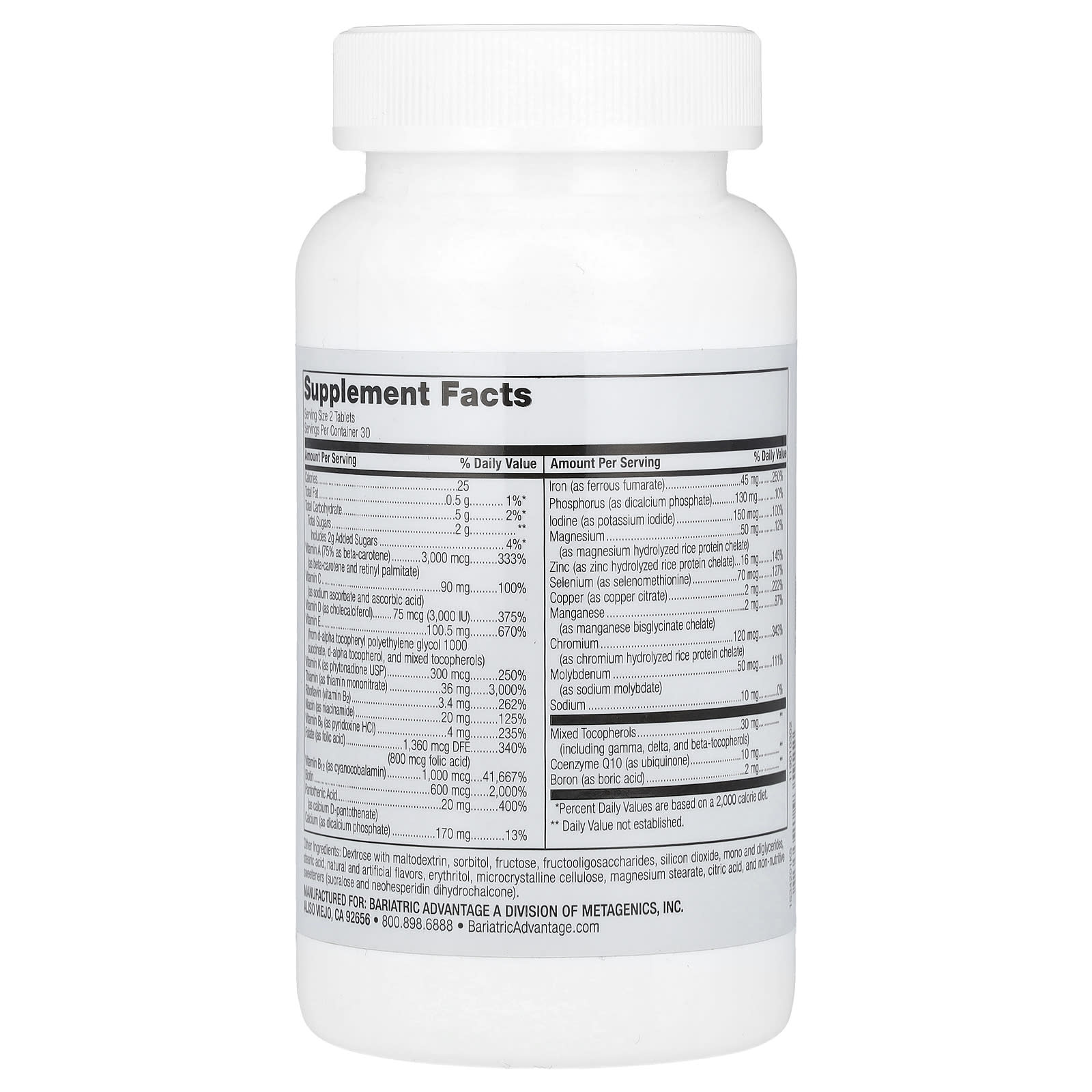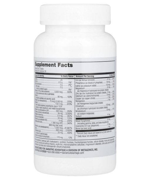 InnovationsArtificially FlavoredDietary SupplementThis Product is Gluten-FreeBariatric Advantage Advanced Multi EA is our most advanced and highest potency multivitamin in an easy-to-take chewable tablet. Specifically formulated with exclusive micelle technology, it helps the body to absorb key nutrients like vitamins E and D. In a recent study, 79% of patients reported seeing improvements in their bloodwork after taking Chewable Advanced Multi EA
