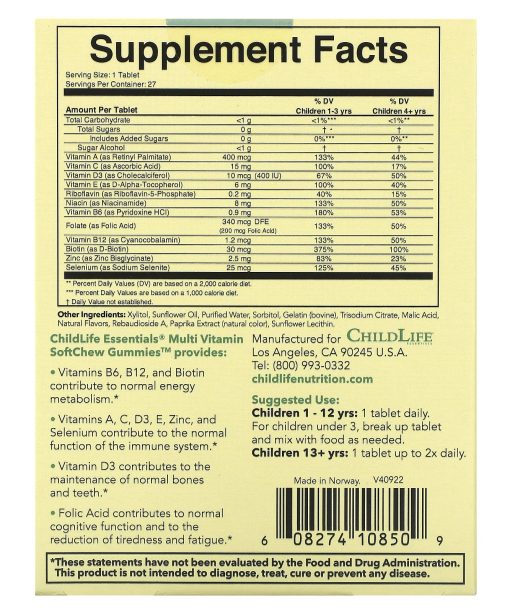 EssentialsNutrition for Kids!®No SugarNo Artificial FlavorsGreat TasteGluten-FreeVitamin Yum – Pure Gummy GoodnessDietary SupplementBetterNutrition – Best of Supplements Award WinnerChildLife Essentials® Multi Vitamin SoftChew Gummies™ provides:Vitamins B6, B12 and Biotin contribute to normal energy metabolism.Vitamins A, C, D3, E, Zinc and Selenium contribute to the normal function of the immune system.Vitamin D3 contributes to the maintenance of normal bones and teeth.Folic Acid contributes to normal cognitive function and to the reduction of tiredness and fatigue.