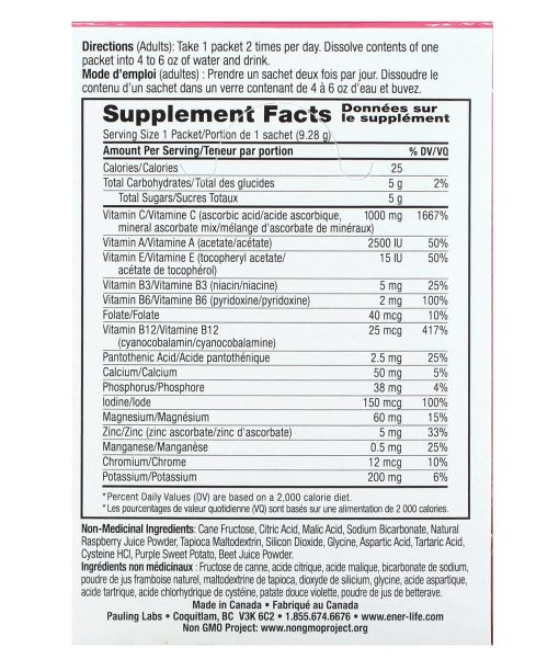 Non-Medicinal Ingredients:  Cane fructose, citric acid, malic acid, sodium bicarbonate, natural raspberry juice powder, tapioca maltodextrin, silicon dioxide, glycine, aspartic acid, tartaric acid, cysteine HCl, purple sweet potato, beet juice powder.