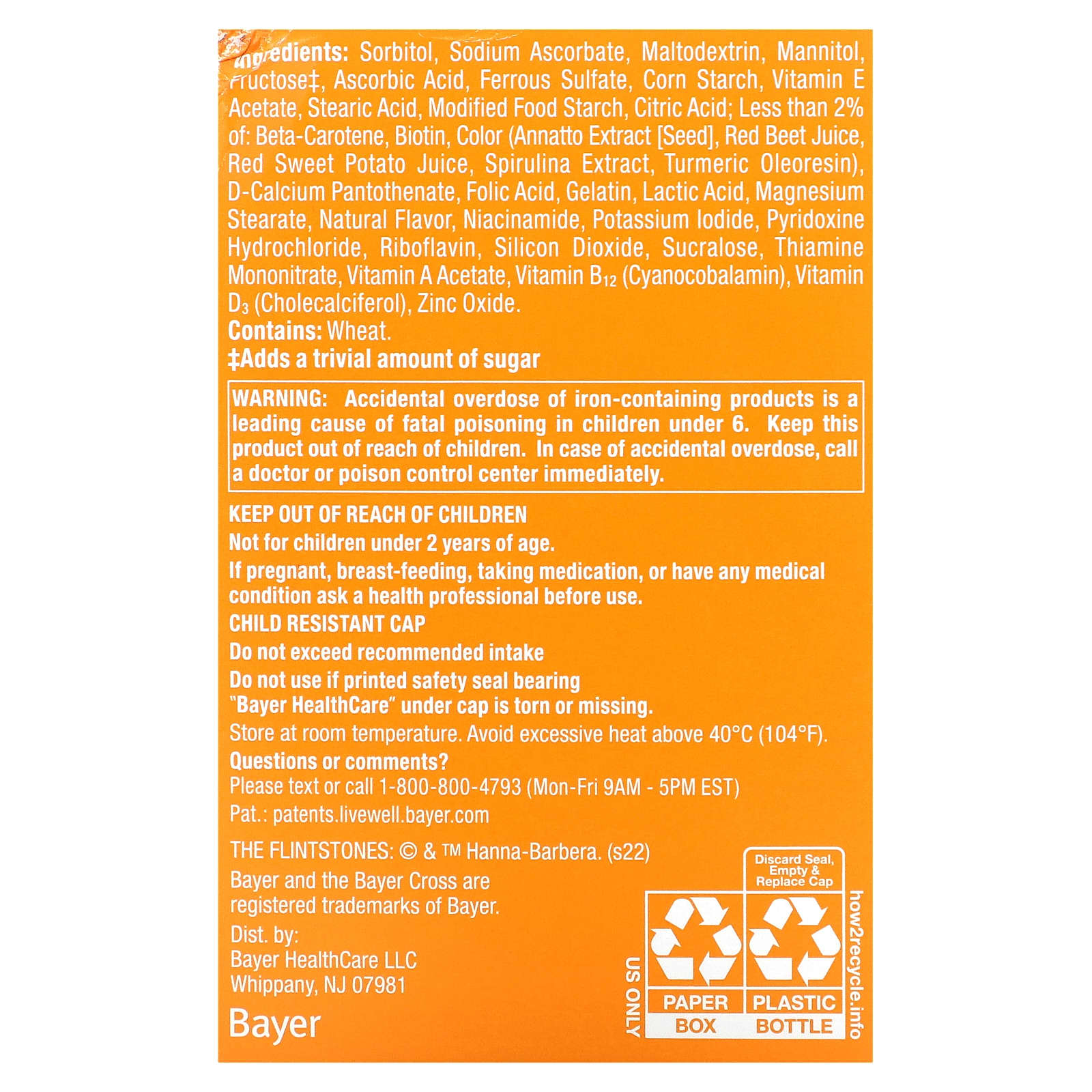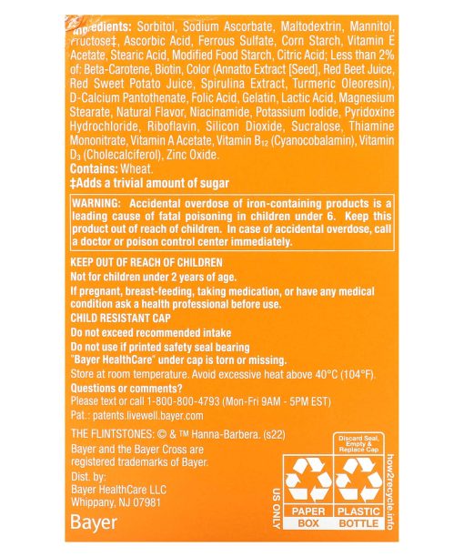 Accidental overdose of iron-containing products is a leading cause of fatal poisoning in children under 6. Keep this product out of reach of children. In case of accidental overdose, call a doctor or poison control center immediately.Keep out of reach of children.Not for children under 2 years of age.If pregnant, breast-feeding, taking medication, or have any medical condition ask a health professional before use.Child resistant cap.Do not exceed recommended intake.Do not use if printed safety seal bearing.*Bayer HealthCare” under cap is torn or missing.Store at room temperature. Avoid excessive heat above 40°C (104°F).