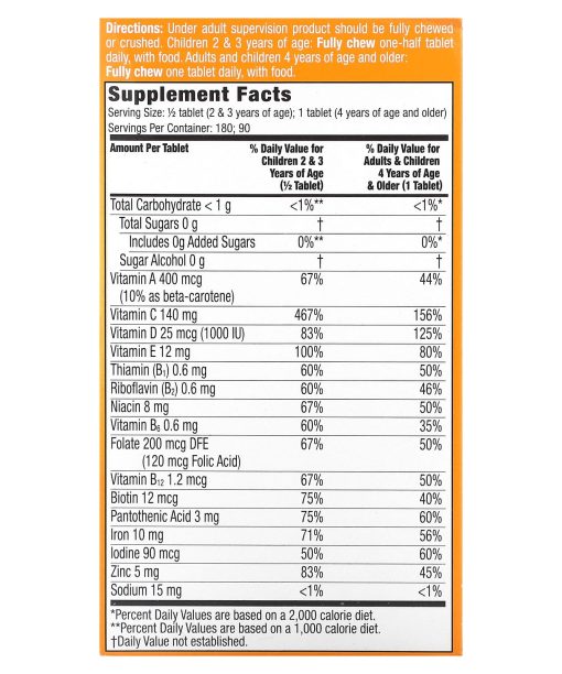 Sorbitol, sodium ascorbate, maltodextrin, mannitol, fructose‡, ascorbic acid, ferrous sulfate, corn starch, vitamin Eacetate, stearic acid, modified food starch, citric acid; less than 2% of: beta-carotene, biotin, color (annatto extract [seed], red beet juice, red sweet potato juice, spirulina extract, turmeric oleoresin), d-calcium pantothenate, folic acid, gelatin, lactic acid, magnesium stearate, natural flavor, niacinamide, potassium iodide, pyridoxine hydrochloride, riboflavin, silicon dioxide, sucralose, thiamine mononitrate, vitamin A acetate, vitamin B12 (cyanocobalamin), vitamin D3 (cholecalciferol), zinc oxide.Contains: wheat.‡adds a trivial amount of sugar