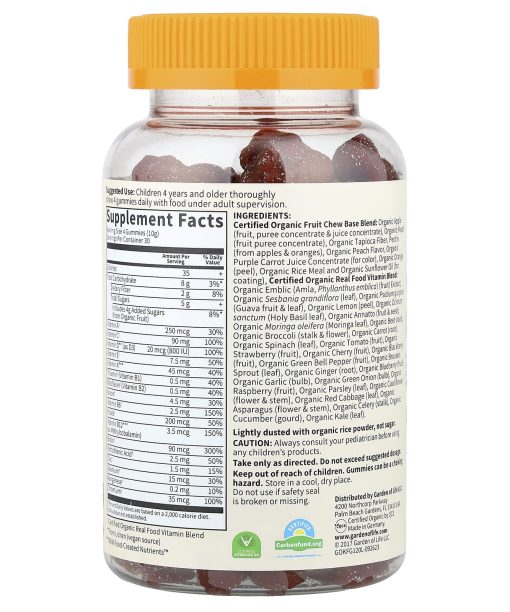 Organic Fruit FlavorUSDA OrganicNon-GMO Project VerifiedReal FruitDietary SupplementKosherContains Vitashine D3Certified Organic by QCS9 Whole Fruits in Every BottleNSF Certified Gluten-FreeSoy, Dairy & Nut-FreeCertified B CorporationOnly the best for your kids, Garden of Life Organics Kids Multi Gummies are Certified USDA Organic and Non-GMO Project Verified fruit and vitamin gummies. Made with nine organic whole fruits in every bottle—no synthetic vitamins—Garden of Life Organics Kids Multi Gummies come in two yummy flavors; organic fruit and organic cherry. Each chew is made with pectin from non-GMO apples and organic orange peel—no pig gelatin.The Garden of Life Organics line of gummies is a true health crusader, ditching the conventional vitamin gummy course by steering clear of processed sugars and syrups, artificial colors and flavorings, animal products, and GMOs. With our clean gummy technology, there are no “candy” ingredients, no pig gelatin or corn starch. You can rest assured you are receiving a true, whole food vitamin fruit chew that not only is good for you, but is great-tasting!