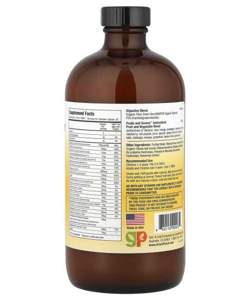Good Manufacturing Practice Certified Enjoy the DifferenceDietary SupplementVeganNon GMOGluten FreeSoy FreeKosher & Halal FriendlyNo Artificial Colors or FlavorsYeast FreeNo Sugar AddedGreenPeach Advanced Multiple Vitamin is a complete, specially formulated liquid supplement with a premium blend of fruits and vegetables designed to offer optimal prebiotic fiber support. Specially made for both adults and kids, and for your comfort and safety, our product contains NO gluten, NO soy, and NO artificial colors or preservatives. Our liquid formula with its natural fruit flavor is a VEGAN-certified, Non-GMO product packed with antioxidants and essential amino acids that are easily absorbed to ensure that your body gets all the nutrients it needs.
