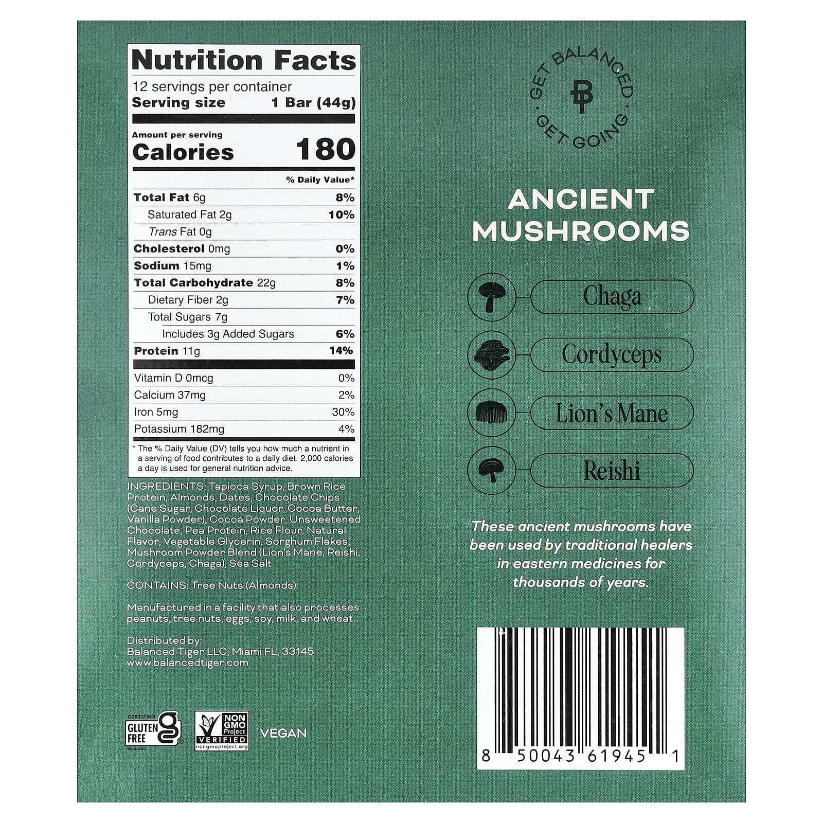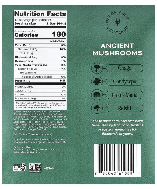 Non GMO Project VerifiedCertified Gluten FreeWith Functional MushroomsMushroom Superfoods11 g Plant Protein180 CaloriesVeganGet Balanced – Get GoingAncient Mushrooms ChagaCordyceps Lion’s Mane Reishi These ancient mushrooms have been used by traditional healers in eastern medicines for thousands of years.