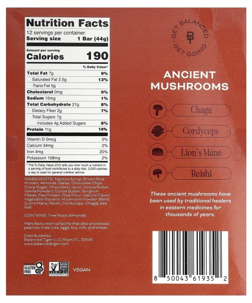 Tapioca syrup, brown rice protein, almonds, dates, chocolate chips (cane sugar, chocolate liquor, cocoa butter, vanilla powder), cocoa butter, sorghum flakes, pea protein, rice flour, natural flavor, vegetable glycerin, mushroom powder blend (lion’s mane, reishi, cordyceps, chaga), sea salt. Contains: Tree Nuts (Almonds) Manufactured in a facility that also processes peanuts, tree nuts, eggs, soy, milk, and wheat.