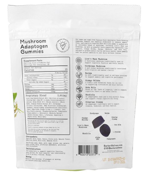 0 g Sugar Per ServingGluten FreeHand Harvested Fruiting BodiesVeganCruelty-FreeReal Fruit ExtractsAll NaturalNo PreservativesNo Artificial FlavorsBrain HealthMemory + Focus + ClarityBrain HealthLion’s Mane + CordycepsAlpha GPC + Bacopa + Ginkgo BiolaGotu Kola + Rhodiola + Siberian GinsengL-TyrosinePomegranateOur vegan and sugar-free Passion Fruit Watermelon Punch Mushroom Adaptogen Gummies are expertly formulated to enhance memory, focus, and cognitive function. Each delicious gummy is packed with an incredible blend of mushrooms, including Lion’s Mane and Cordyceps, as well as powerful brain-supporting ingredients like Cognizin, Ginkgo Biloba, Bacopa, Rhodiola, and Gotu Kola. Designed to promote mental clarity and brain health, these gummies make the perfect addition to your daily wellness routine.​Lion’s Mane Mushroom A functional mushroom traditionally used to support cognitive function and brain health. Cordyceps Mushroom A well-known mushroom traditionally associated with vitality and mental clarity. Bacopa An herb traditionally used in wellness practices to support memory and cognitive performance. Ginkgo Biloba A widely used botanical known for its role in supporting circulation and brain function. Gotu Kola Known as the “herb of longevity,” used to support cognitive function and mental clarity. Rhodiola An adaptogenic herb used to help maintain focus and support overall cognitive well-being. Siberian Ginseng An adaptogen traditionally used to support stamina, endurance, and brain function.