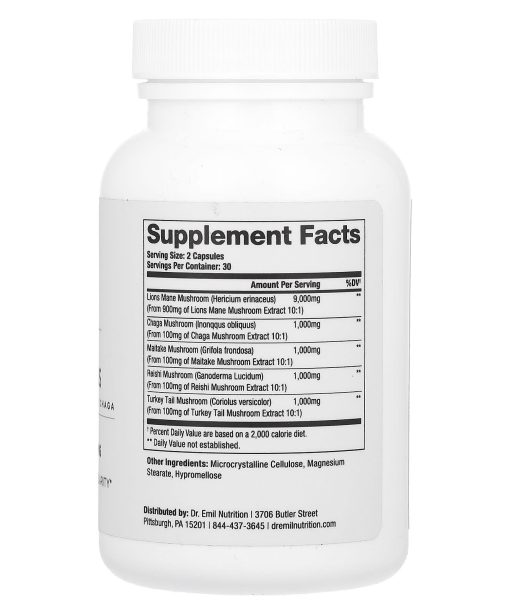 Reishi | Maitake | Turkey Tail | Chaga 10:1 Extract Equivalent to 9,000 mg Supports Memory, Focus, and ClarityDietary Supplement 30 Day SupplyNon GMOVegan FriendlyGluten FreeHarnessing the power of five potent mushrooms, this formula offers an unparalleled synergy of cognitive and immune support.