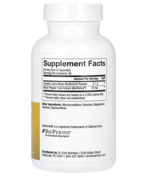 Supports Focus, Immunity & MemoryDietary SupplementNon GMOVegan FriendlyGluten FreeBioPerine® for Enhanced AbsorptionLions Mane nootropic brain and immunity booster provides the highest possible dosage available on the market. Dr. Emil’s formula is enhanced with BioPerine, a Black Pepper extract clinically proven to aid in absorption.